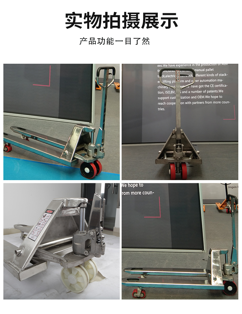 Stainless steel is known for its excellent corrosion resistance. It can withstand exposure to moisture, chemicals, and other corrosive agents that would quickly degrade other materials. This means that even in environments such as food processing plants, chemical factories, or outdoor storage areas, our pallet truck will remain in top condition, reducing the need for frequent replacements and maintenance.